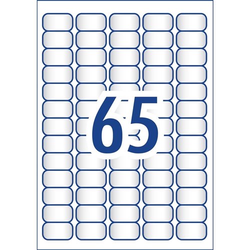 Size: 38.1x21.2mm 1625 labels, 25 sheets. 65 labels per sheet (65UP).