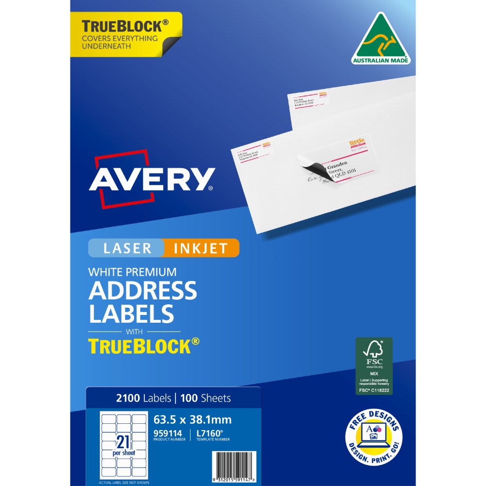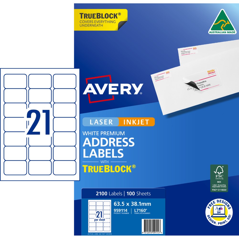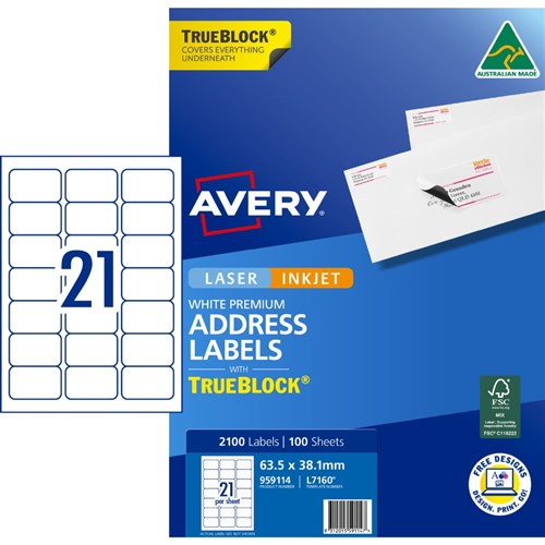 Avery Trueblock Address Labels Laser L7160 63.5 x 38.1mm 21UP 2100 Labels