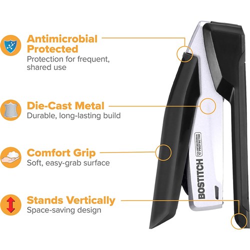 Built-in Antimicrobial properties to protect from inhibiting the growth of bacteria on the stapler.