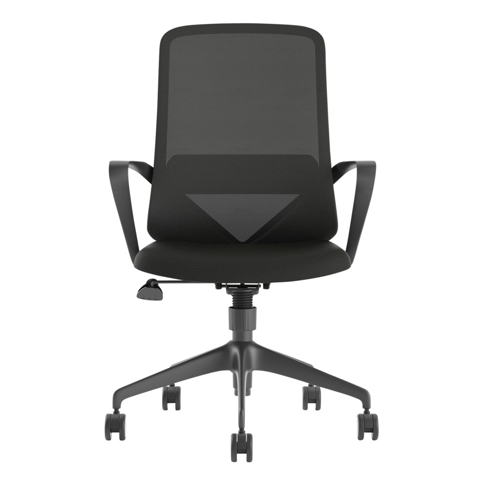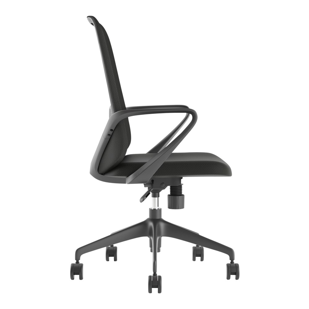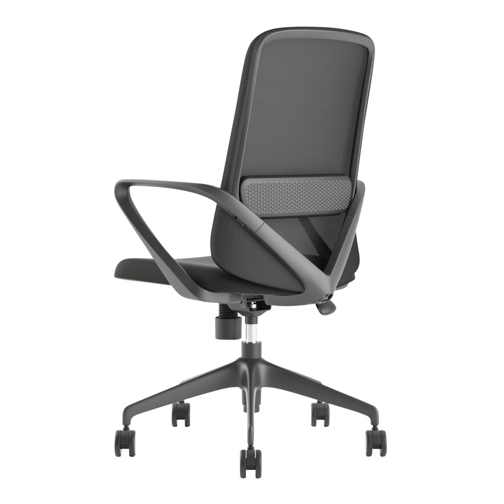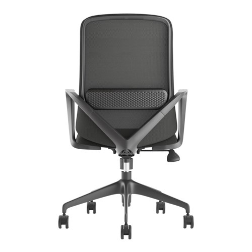 Composition: Mesh back with lumbar support, upholstered seat and strong nylon 5 star base with 60mm nylon castors. Fixed looped armrests.