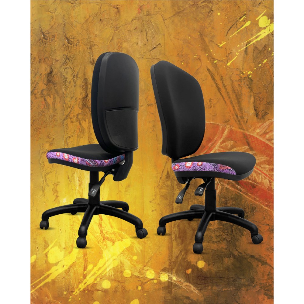 • A unique commercial fabrics designed by Andrea Adamson (Indigenous Artist) combined with K2 Black Fabric to upholster the chair.