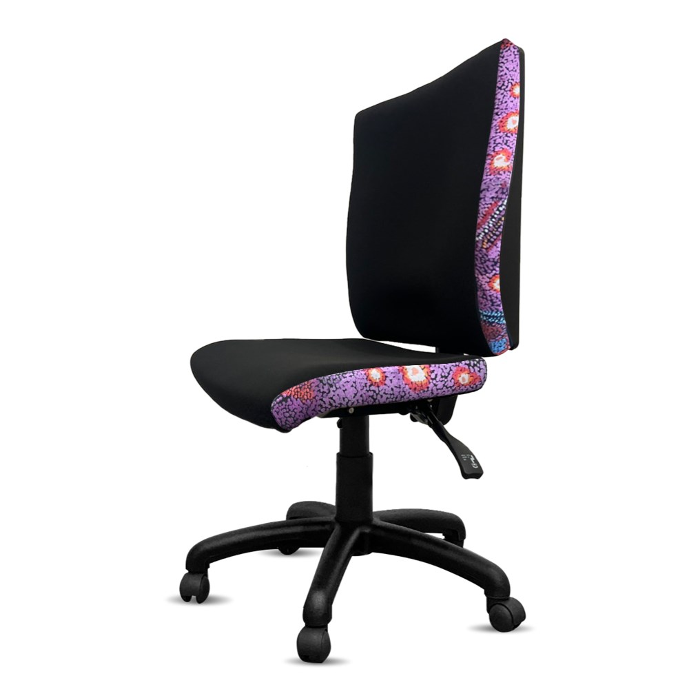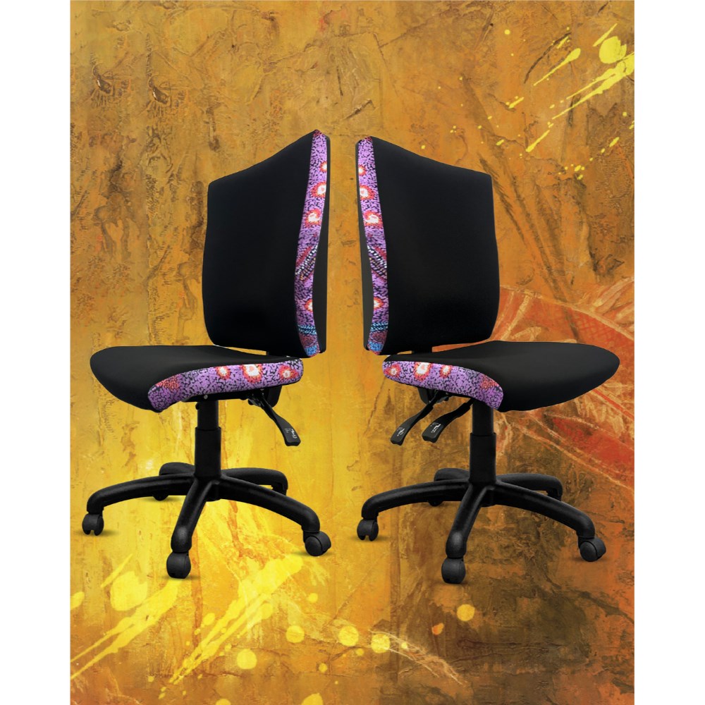 A unique commercial fabrics designed by Andrea Adamson (Indigenous Artist) combined with K2 Black Fabric to upholster the chair.