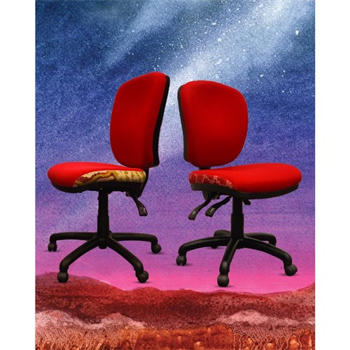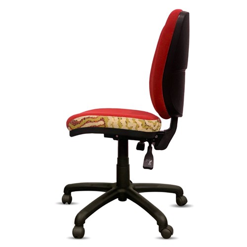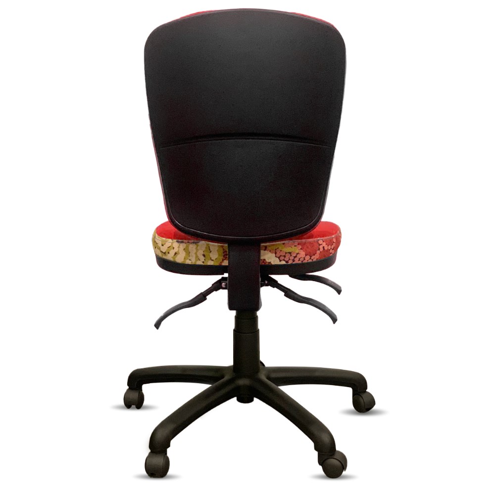 A unique commercial fabrics designed by Damien and Yilpi Marks (Indigenous artists) combined with K2 Red Ochre Fabric to upholster the chair.