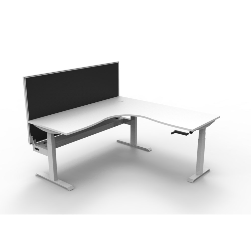 Rapidline Boost manual crank height adjustable corner workstation with cable tray and screen. White top with white frame.