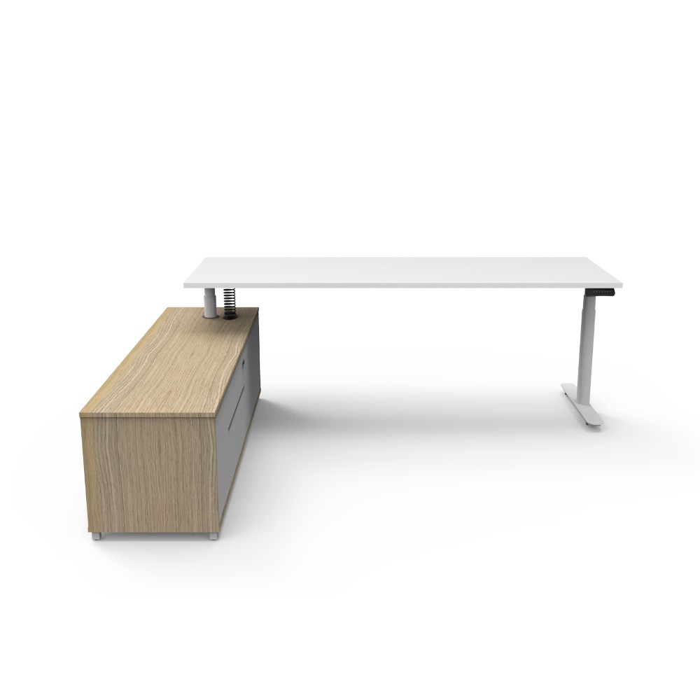 Natural White top and White Satin frame. Height adjustable desk with left hand side cabinet.