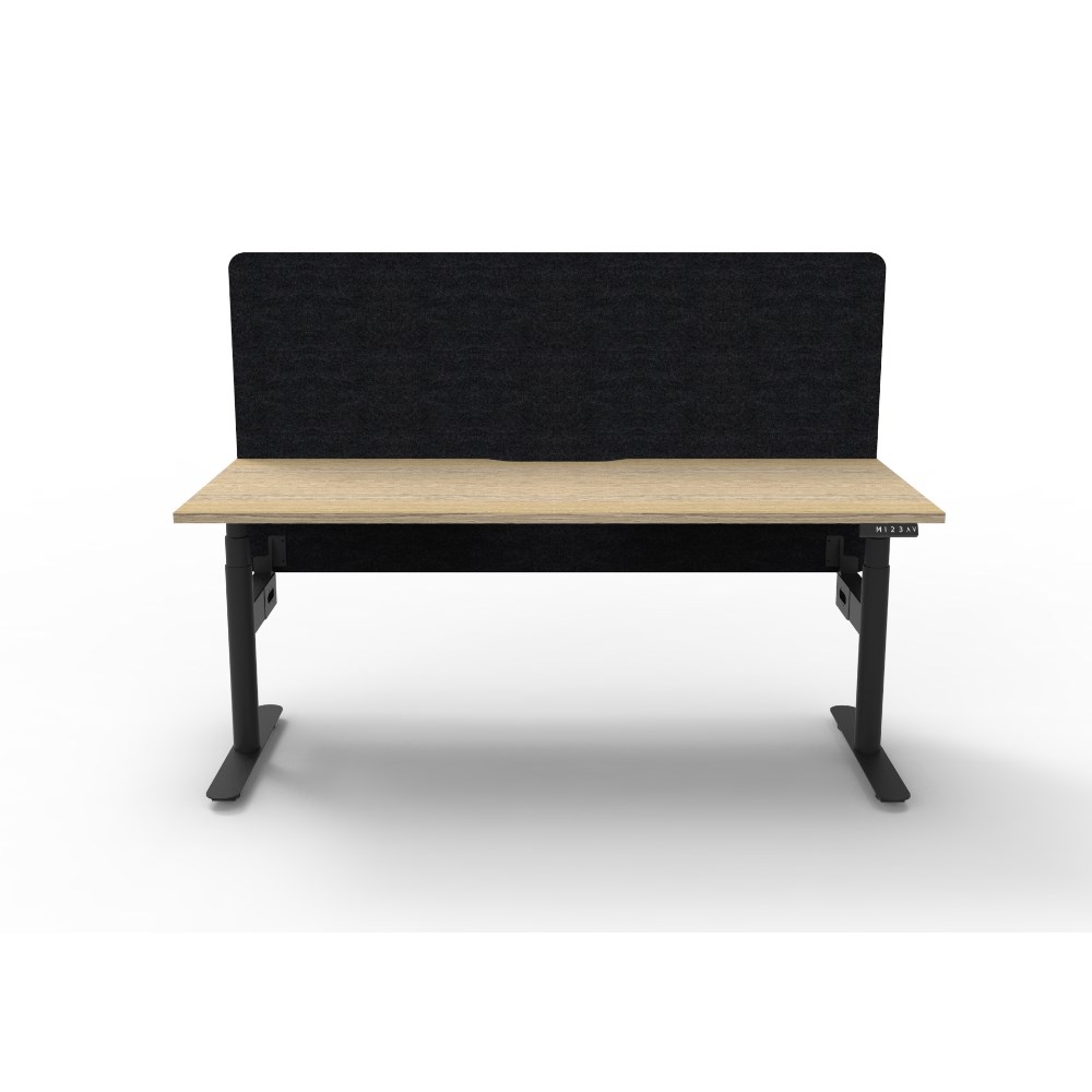 Natural Oak worksurface with rigid edging and 50mm scallop cable cut out. E0 rated 25mmT top. Black Satin powder coat round-leg frame. Eco screen.