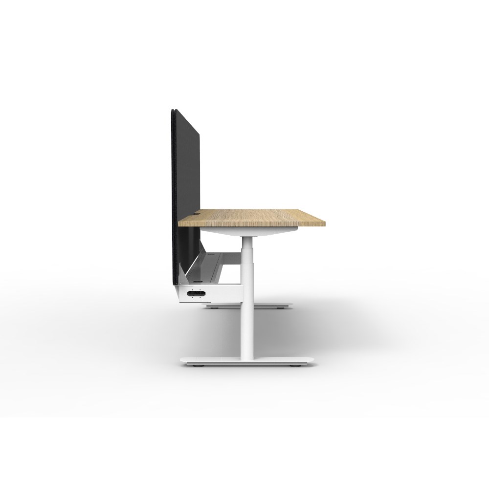 Natural Oak worksurface with rigid edging and 50mm scallop cable cut out. E0 rated 25mm top. White Satin powder coat round-leg frame. Eco screen and cable tray.