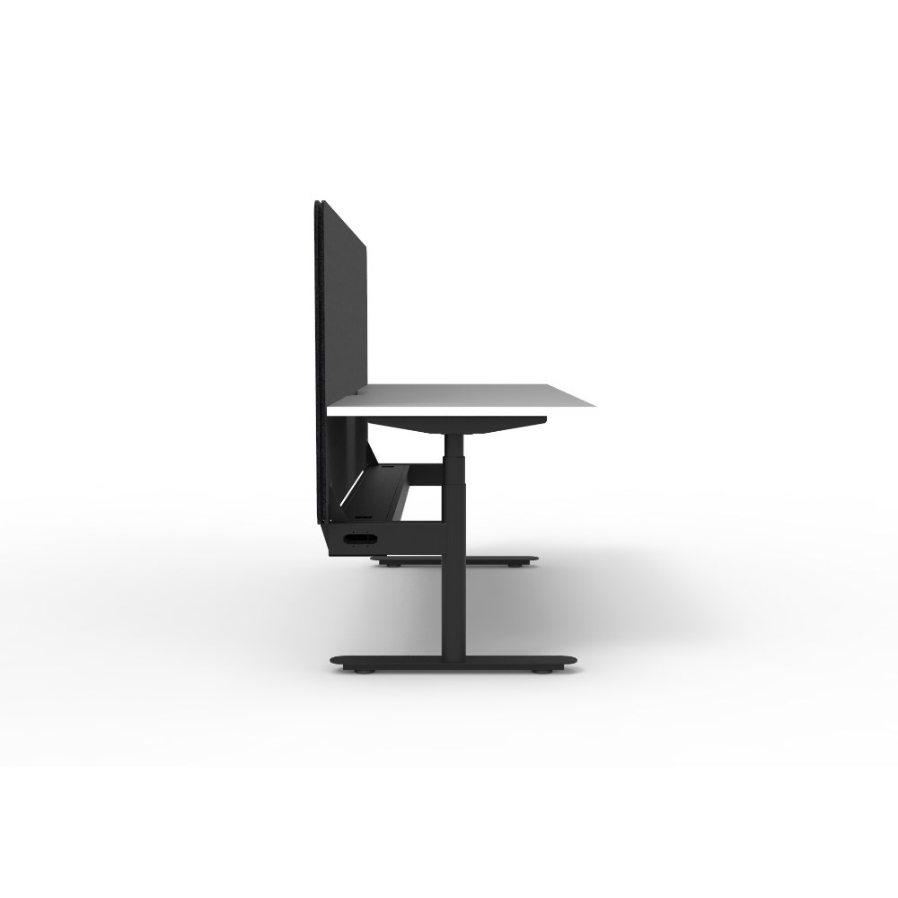 Natural White worksurface with rigid edging and 50mm scallop cable cut out. E0 rated 25mm top. Black Satin powder coat round-leg frame. Eco screen and cable tray.