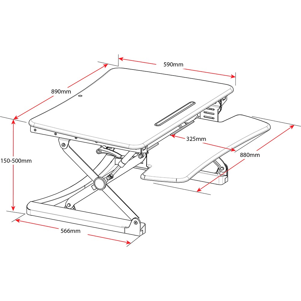 Work surface size 890mm W x 590mm D. Height adjustable 150-500mm high.