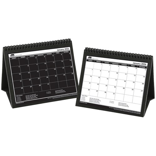 Compact and durable construction desk calendar with twin wire-o binding.