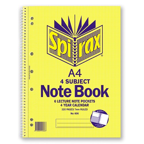 Spirax 606 4 Subject Notebook Perforated/Note Pockets A4 Ruled 320 Page Side Opening