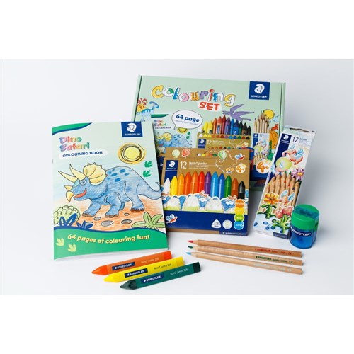 Includes 64 page colouring book, 12 Natural Jumbo Triangular Coloured Pencils, 12 Noris Jumbo Triangular Wax Crayons and 1 Piece Double Hole Tub Sharpener.