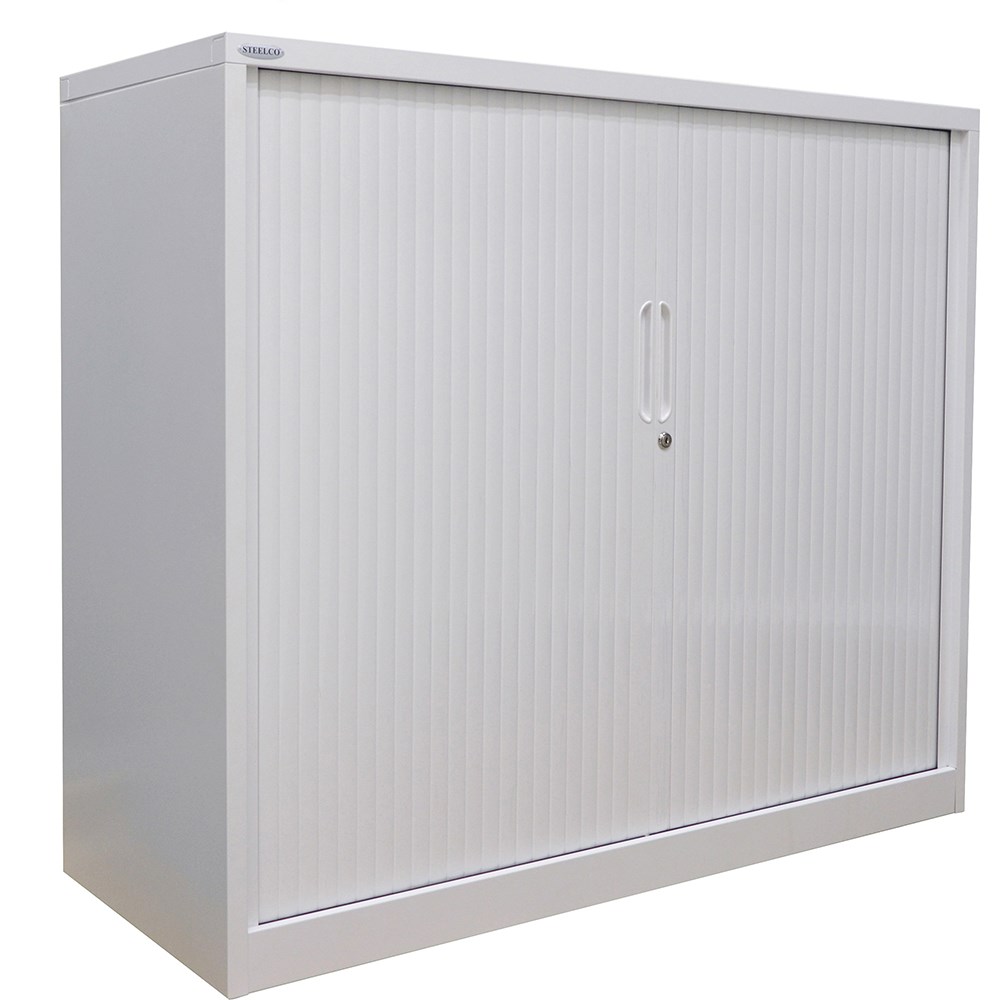 Steelco Tambour Door Cupboard Includes 3 Shelves 900W x 463D x 1200mmH Silver Grey