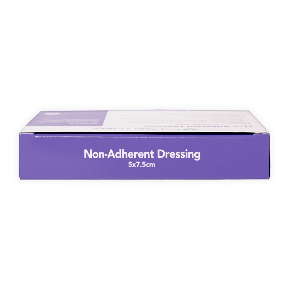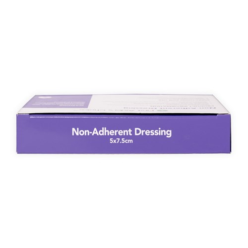 Non-stick dressing minimises adherence to wound.