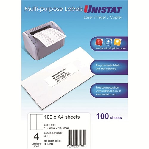 Unistat Laser Copier & Inkjet Labels 105x148mm 4UP 400 Labels 100 Sheets