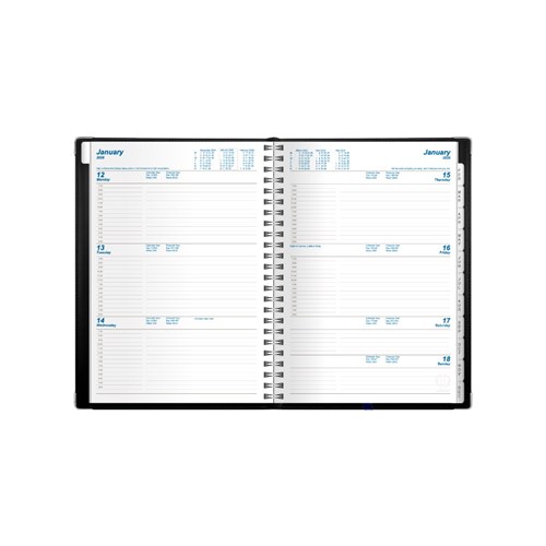 Double wire binding. Lay flat opening. Ribbon marker. Tabs. Translucent pocket.
