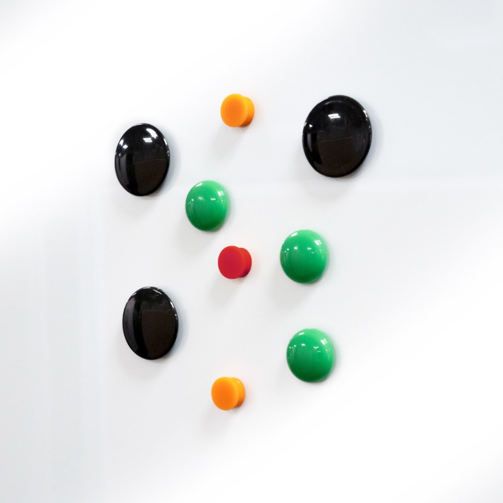 Colourful magnets for pinning items to whiteboards, cabinets, fridges or any metallic surface.