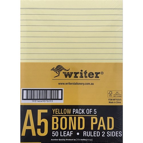 Writer A5 Premium Bond Pad 50 Sheet Ruled 2 Sides Yellow Pack Of 5